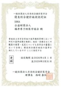 一般社団法人日本総合健診医学会独自の厳しい条件を満たす施設が「優良総合健診施設」として認定された認定証です。